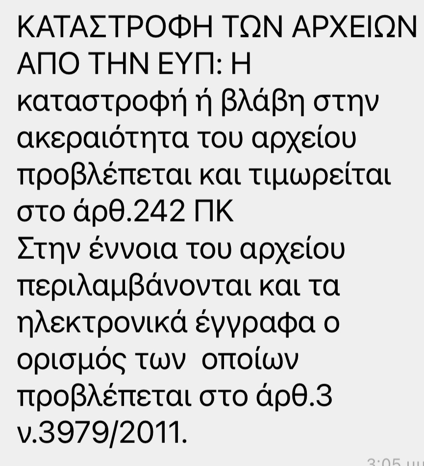 ΚΑΤΑΣΤΡΟΦΗ ΤΩΝ ΑΡΧΕΙΩΝ ΑΠΟ ΤΗΝ ΕΥΠ: Η καταστροφή ή βλάβη στην ακεραιότητα του αρχείου προβλέπεται και τιμωρείται στο άρθ.242 ΠΚ. Στην έννοια του αρχείου περιλαμβάνονται και τα ηλεκτρονικά έγγραφα ο ορισμός των οποίων προβλέπεται στο άρθ.3 ν.3979/2011.