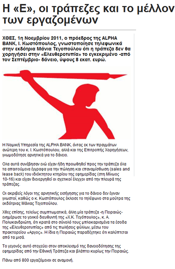 Στο σημερινό πρωτοσέλιδό της, αναφέρεται πως χθες ο πρόεδρος της Alpha Bank, Γιάννης Κωστόπουλος, γνωστοποίησε τηλεφωνικά στην εκδότρια, Μάνια Τεγοπούλου, ότι η τράπεζα δεν θα χορηγήσει το εγκεκριμένο από τον Σεπτέμβριο δάνειο ύψους 8 εκατομμυρίων ευρώ.
