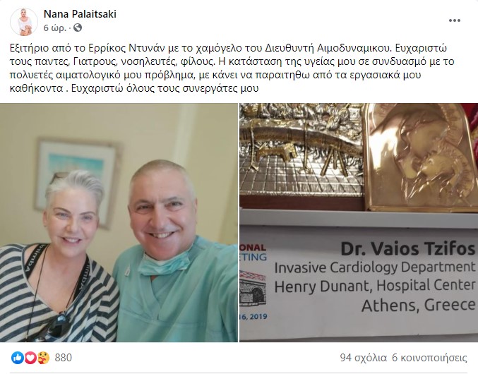 «Εξιτήριο από το Ερρίκος Ντυνάν με το χαμόγελο του Διευθυντή Αιμοδυναμικού. Ευχαριστώ τους πάντες, Γιατρούς, νοσηλευτές, φίλους. Η κατάσταση της υγείας μου σε συνδυασμό με το πολυετές αιματολογικό μου πρόβλημα, με κάνει να παραιτηθώ από τα εργασιακά μου καθήκοντα . Ευχαριστώ όλους τους συνεργάτες μου» έγραψε η Νανά Παλαιτσάκη στην ανάρτησή της.