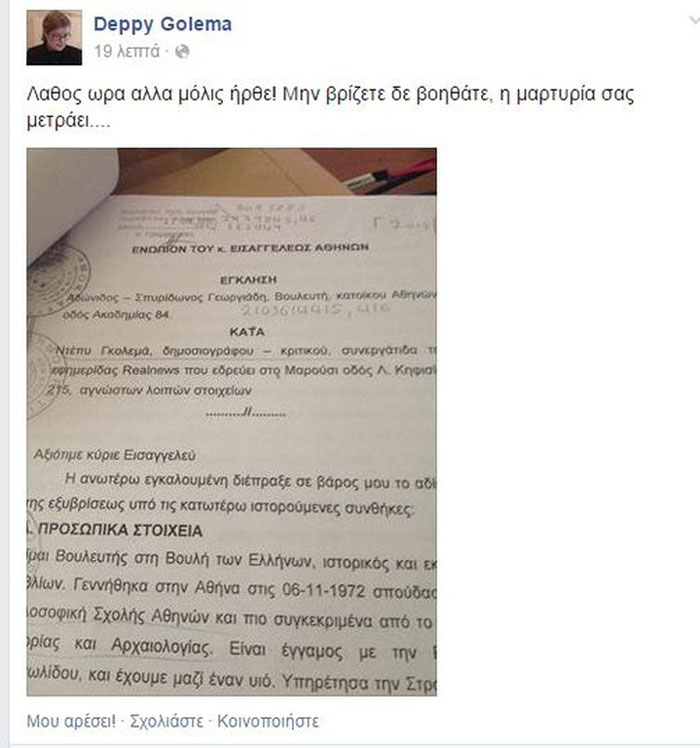 Ο Άδωνις στη συνέχεια της έκανε αγωγή για εξύβριση και σήμερα η δημοσιογράφος έλαβε την αγωγή, την φωτογράφισε και την ανέβασε στο facebook, γράφοντας: «Λάθος ώρα αλλά μόλις ήρθε! Μην βρίζετε δε βοηθάτε, η μαρτυρία σας μετράει….»!