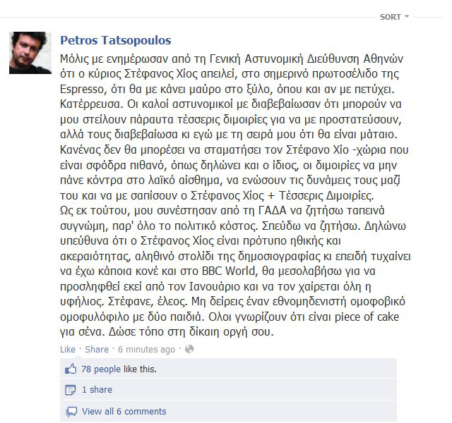 Η έντονη αντιπαράθεση ξεκίνησε από ένα post του βουλευτή για τον δημοσιογράφο στο οποίο αναφερόταν: «Ένα από τα πιο σπαρταριστά θεάματα ήταν να παρακολουθείς αυτήν τη σκατοσακούλα, τον Στέφανο Χίο».