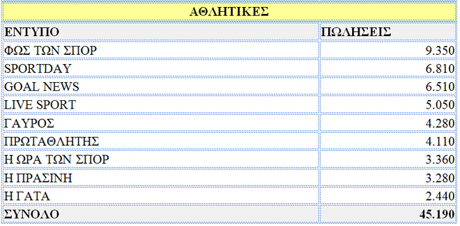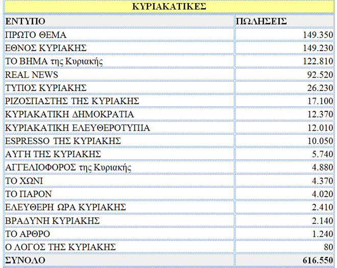 Πανελλαδικό δελτίο κυκλοφορίας κυριακάτικων εφημερίδων