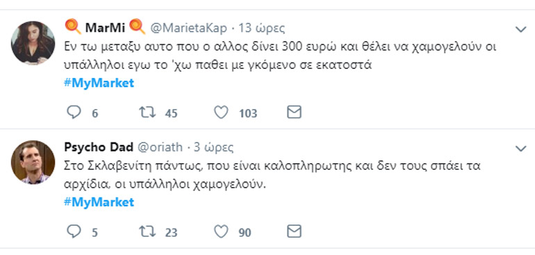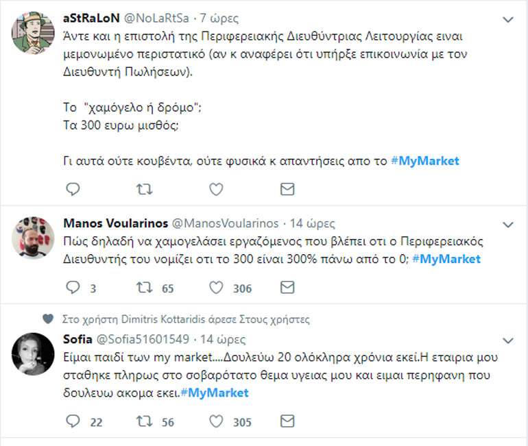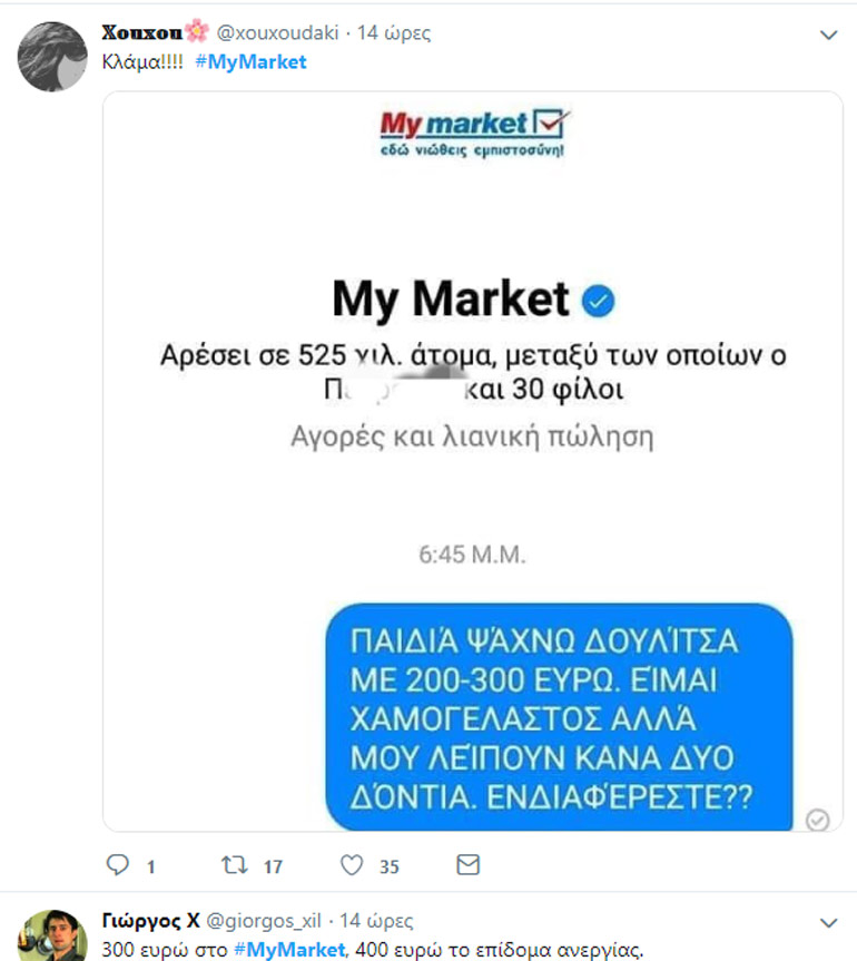 «Πάρτι» γίνεται στο Twitter μετά την αποκάλυψη της θρασύτατης επιστολής προϊσταμένης των My Market σε εργαζόμενους, με το hashtag #MyMarket να είναι το κορυφαίο στο εν λόγω μέσο κοινωνικής δικτύωσης από χθες.