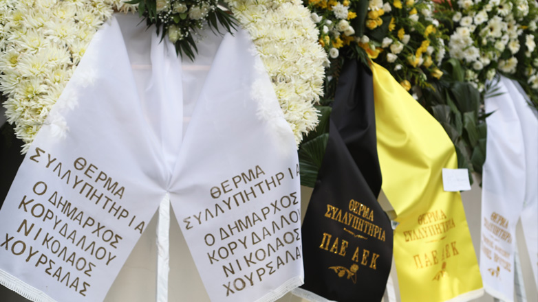 Στεφάνια κατέθεσαν ο αναπληρωτής υπουργός Αθλητισμού Γιάννης Βρούτσης, η βουλευτής Νίνα Κασιμάτη, η αντιπεριφερειάρχης Πειραιά Σταυρούλα Αντωνάκου, ο δήμαρχος Κορυδαλλού Νίκος Χουρσαλάς, ο Θόδωρος και η Γιάννα Αγγελοπούλου, ο πρόεδρος και τα μέλη της Εκτελεστικής Επιτροπής της ΕΠΟ, η ΠΑΕ ΑΕΚ, το Δ.Σ. του ΠΣΑΤ, η Ένωση Αθλητικογράφων Κύπρου, το Δ.Σ. της ΕΣΗΕΑ, ο πρόεδρος του ΠΣΑΤ Βαγγέλης Ιωάννου, ο επίτιμος αντιπρόεδρος του ΠΣΑΤ Κώστας Μυλωνάς, ο πρόεδρος και του Δ.Σ. του ΕΣΑΚΕ, η Διοίκηση της ΕΡΤ, ο δικηγόρος Βασίλης Καπερνάρος, οι παλαίμαχοι της Προοδευτικής, ο ΠΑΣ Παμβοχαϊκού, ο Σύνδεσμος Οιτυλιωτών Αθηνών και άλλοι προσωπικοί φίλοι του εκλιπόντος.