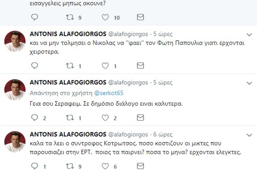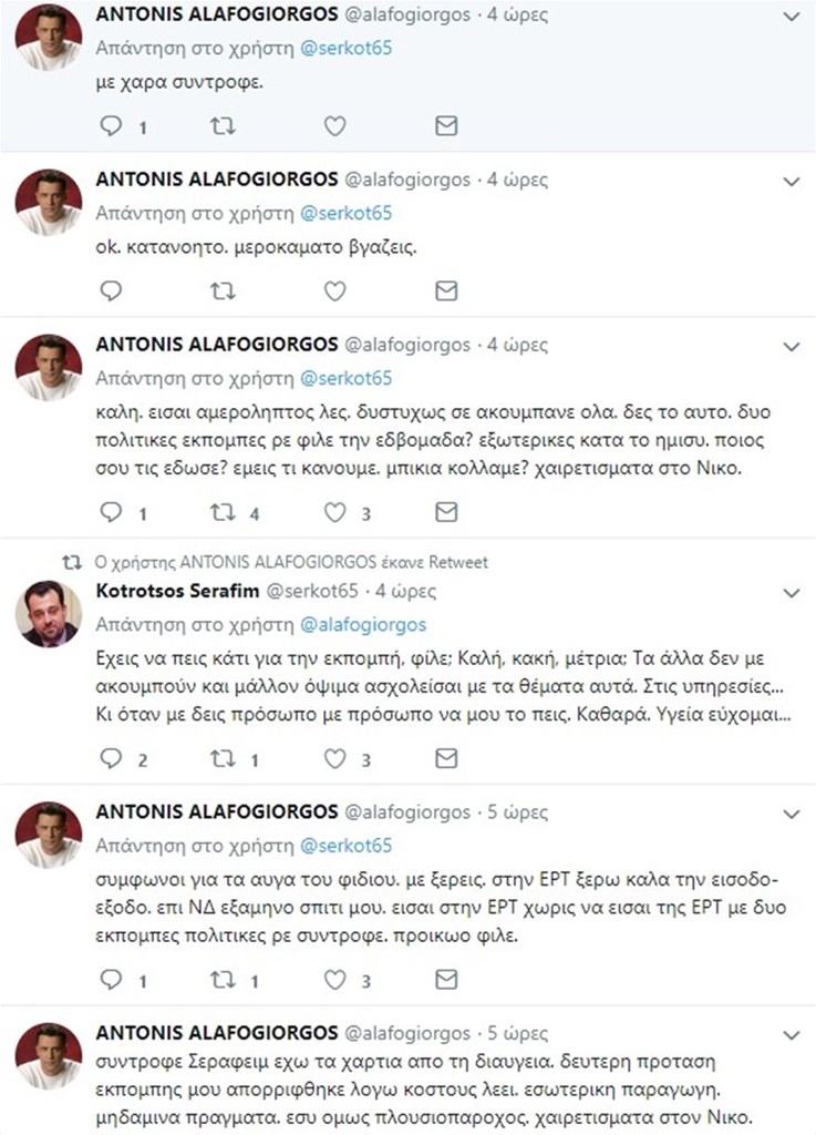 Ειδικότερα, ο παρουσιαστής Αντώνης Αλαφογιώργος, με ανάρτησή του στο Twitter, κάλεσε τον πρόεδρο της Ένωσης Εισαγγελέων, Δημήτρη Ασπρογέρακα, να ελέγξει το δημόσιο χρήμα στην ΕΡΤ. Ταυτόχρονα, άφησε αιχμές για σχέσεις Κοτρώτσου – Παππά και αποκάλυψε ότι «έκοψαν» πρόταση εκπομπής του ιδίου λόγω κόστους.