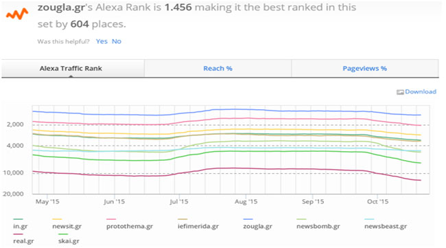*Με μπλε χρώμα το zougla.gr, πρώτο σε επισκεψιμότητα, 604 θέσεις μπροστά από το δεύτερο protothema.gr και 1.373 θέσεις από το τρίτο newsit.gr.