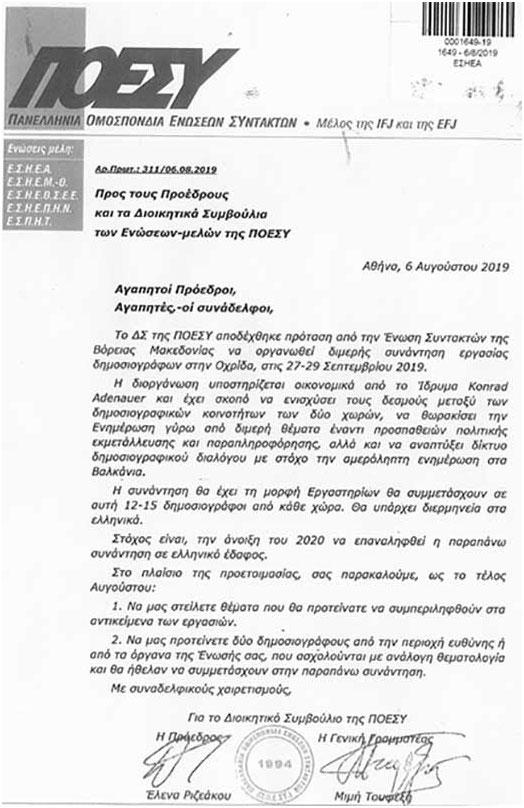 Έκπληξη προκαλεί η ανακοίνωση της ΠΟΕΣΥ που αποδέχθηκε πρόσκληση «από την Ένωση Συντακτών της Βόρειας Μακεδονίας» να οργανωθεί διμερής συνάντηση εργασία στην Οχρίδα στις 27-29 Σεπτεμβρίου 2019 στην Οχρίδα». Καθώς και ότι «η συνάντηση υποστηρίζεται οικονομικά από το ίδρυμα Konrad Adenauer». (Αχ αυτοί οι φίλοι Γερμανοί… πόσο προωθούν τις Πρέσπες).