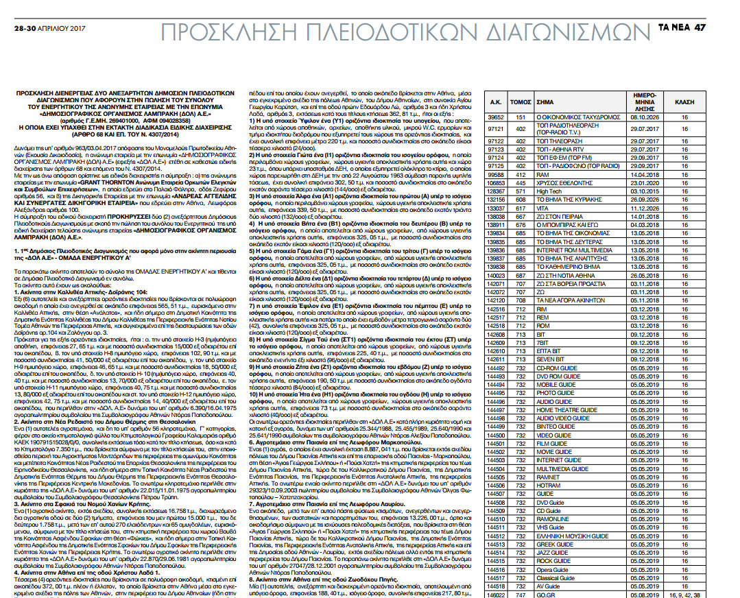Μέσω δύο πλειοδοτικών διαγωνισμών θα πραγματοποιηθεί η πώληση του συνόλου του ενεργητικού του Δημοσιογραφικού Οργανισμού ΛαμπράκηΣύμφωνα με την πρόσκληση των διαγωνισμών που θα πραγματοποιήσει η σύμπραξη των ειδικών διαχειριστών (της Grant Thornton και της Δικηγορικής Εταιρείας Αγγελίδης), η πώληση του συνόλου του ενεργητικού της ΔΟΛ Α.Ε., η οποία έχει υπαχθεί στην έκτακτη διαδικασία ειδικής διαχείρισης, διαχωρίστηκε μεταξύ της ακίνητης περιουσίας και των υπόλοιπων στοιχείων του ενεργητικού, σημάτων, λοιπών παγίων, συμπεριλαμβανομένων των τίτλων «Τα Νέα», «Το Βήμα» και «Ο Ταχυδρόμος», μεταξύ άλλων.