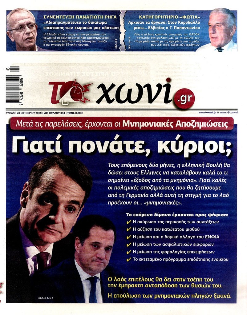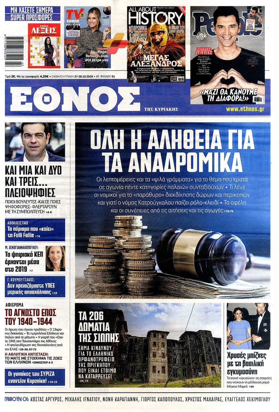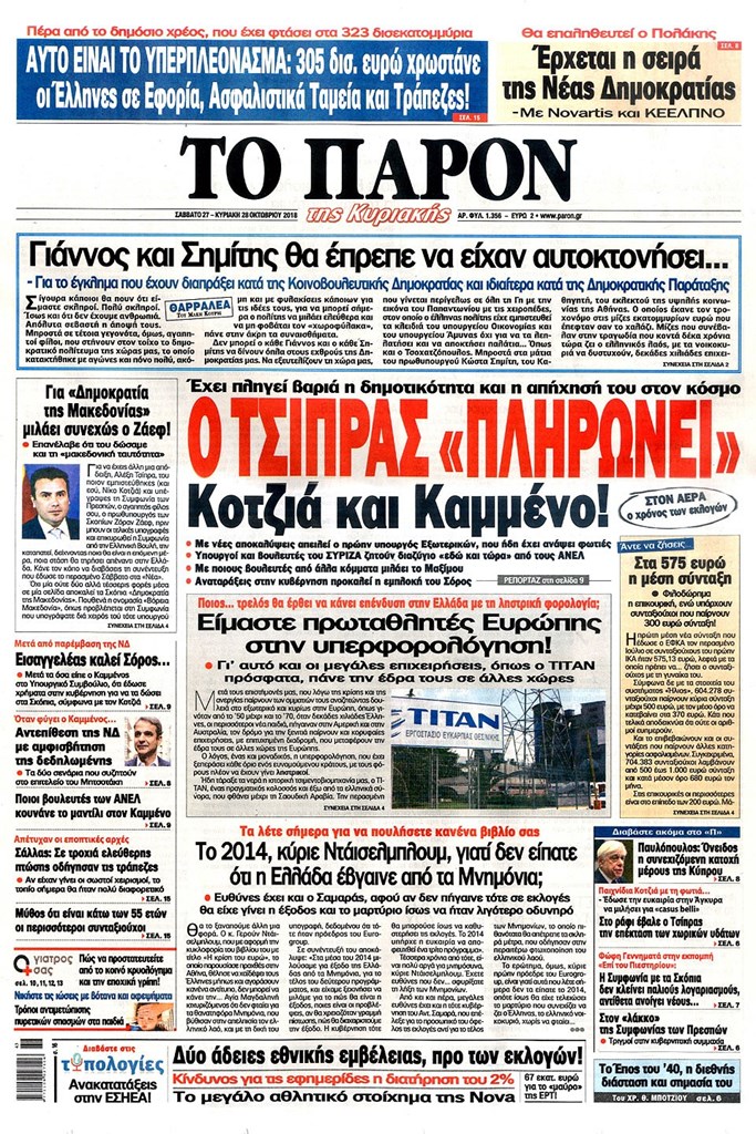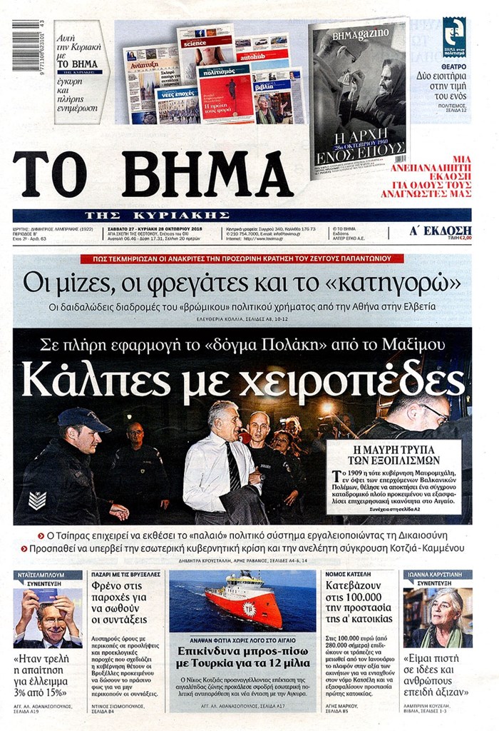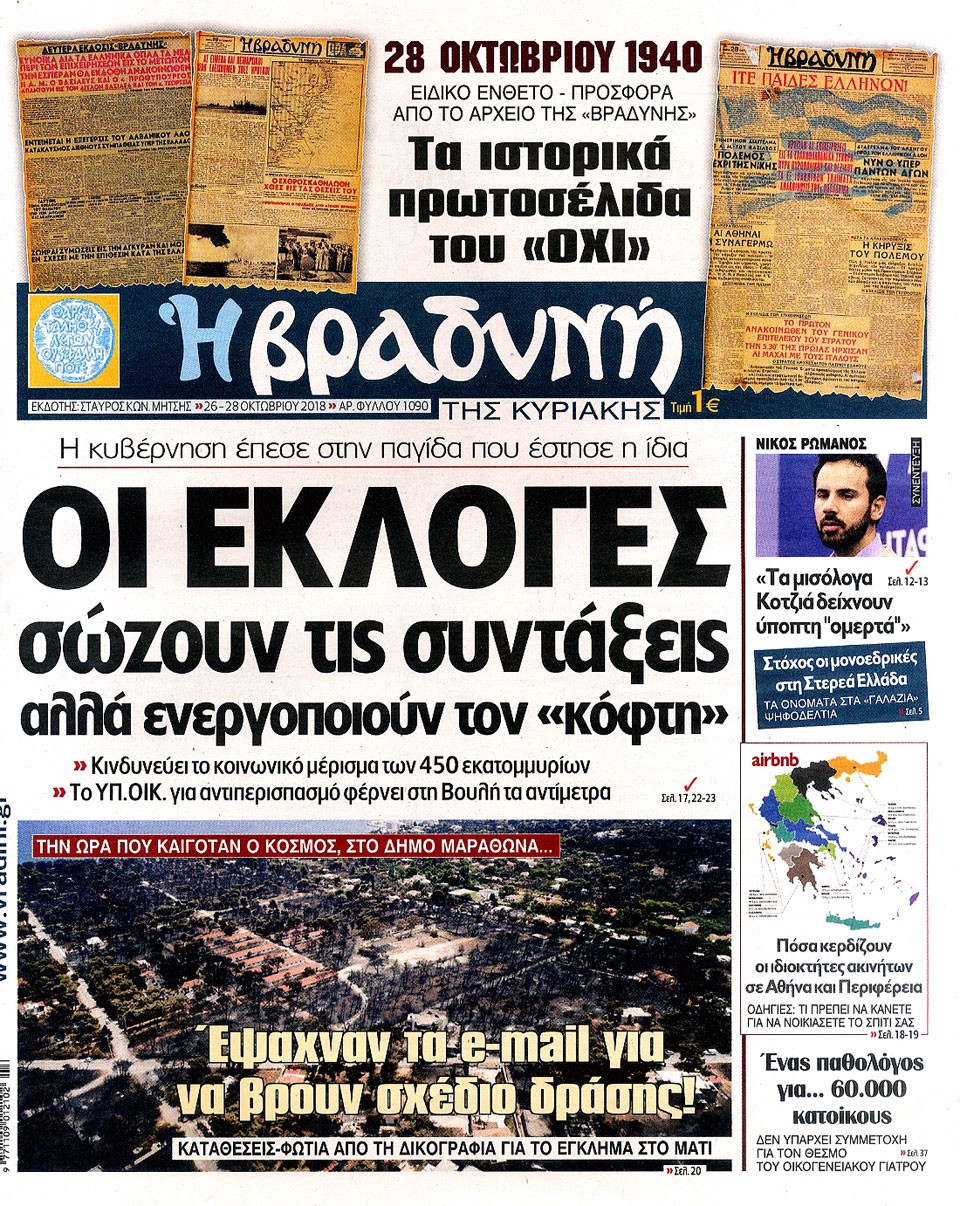 Διαβάστε στο zougla.gr τα πρωτοσέλιδα και τα οπισθόφυλλα των εφημερίδων της Κυριακής που κυκλοφορούν εκτάκτως το Σάββατο λόγω του εορτασμού της 28ης Οκτωβρίου.
