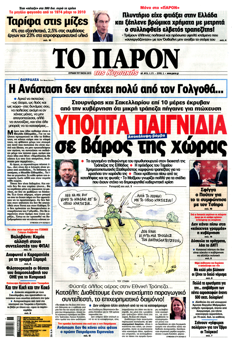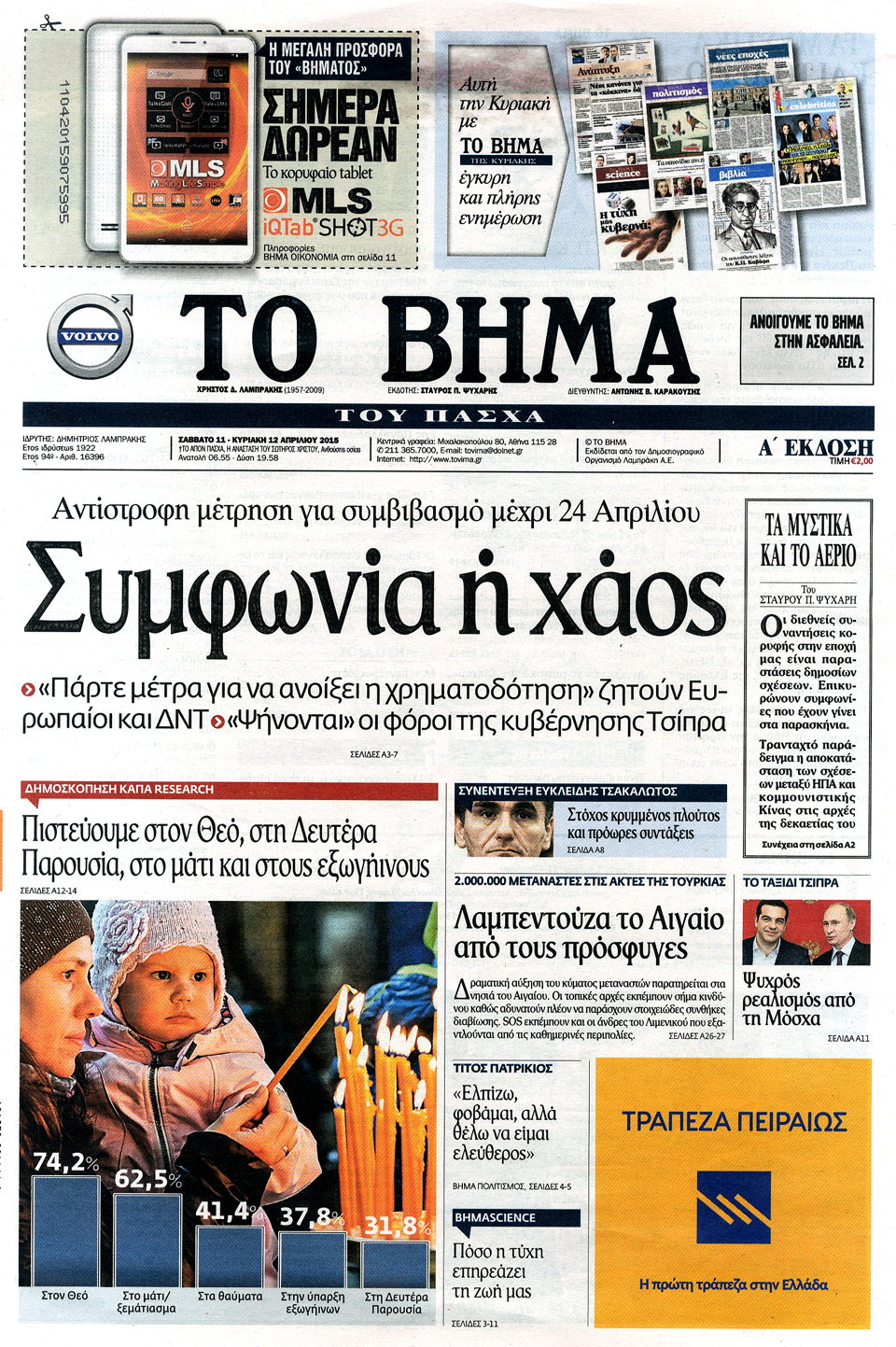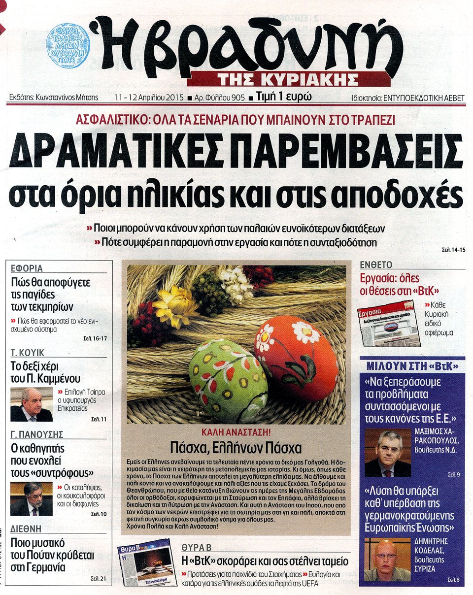 Διαβάστε στο zougla.gr τα πρωτοσέλιδα των κυριακάτικων εφημερίδων που κυκλοφορούν εκτάκτως το Μεγάλο Σάββατο.