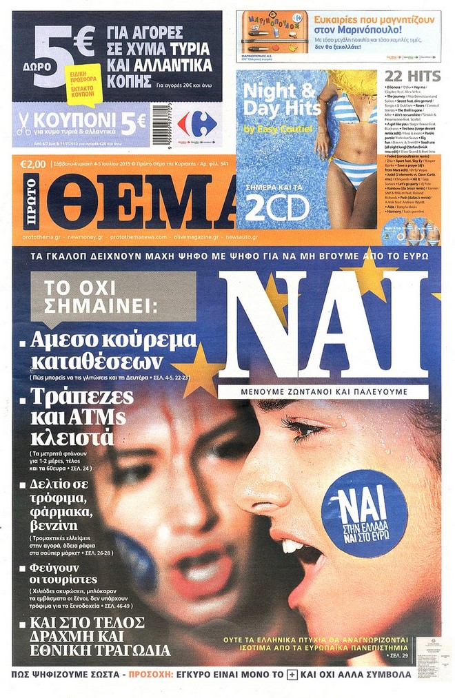 Διαβάστε τα πρωτοσέλιδα των κυριακάτικων εφημερίδων που κυκλοφορούν εκτάκτως το Σάββατο λόγω της διεξαγωγής του δημοψηφίσματος στις 5 Ιουλίου.