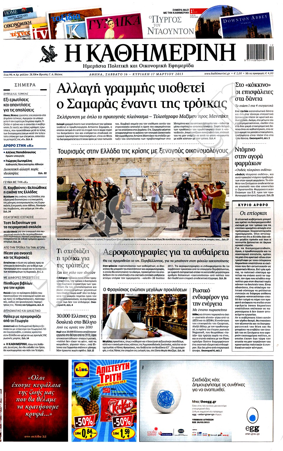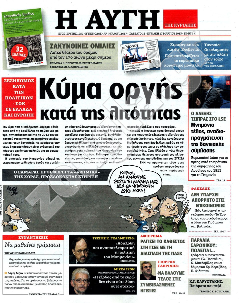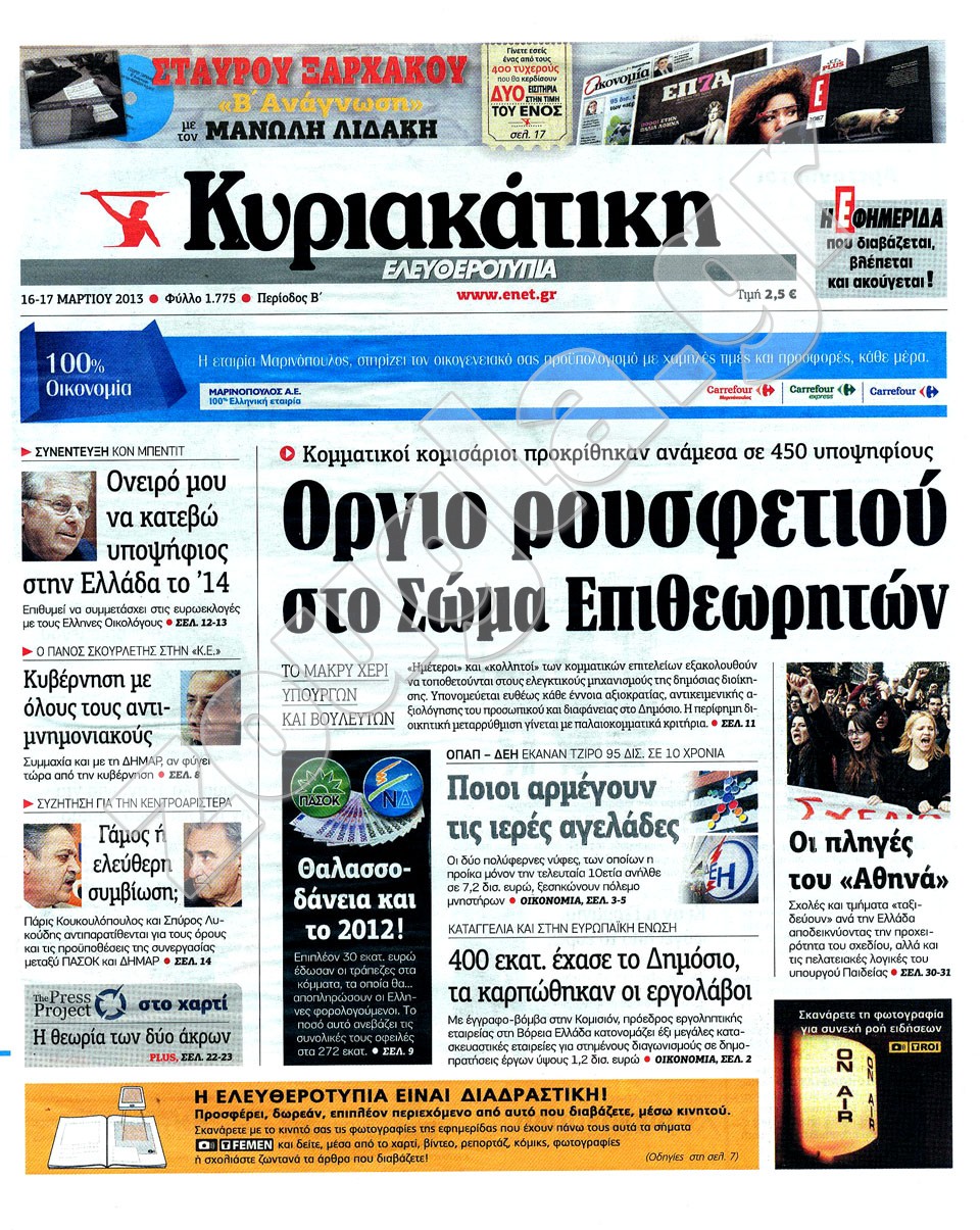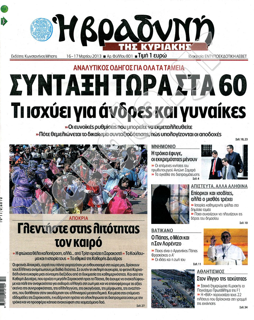 Διαβάστε από σήμερα στη zougla.gr τα πρωτοσέλιδα των κυριακάτικων εφημερίδων που κυκλοφορούν εκτάκτως το Σάββατο.