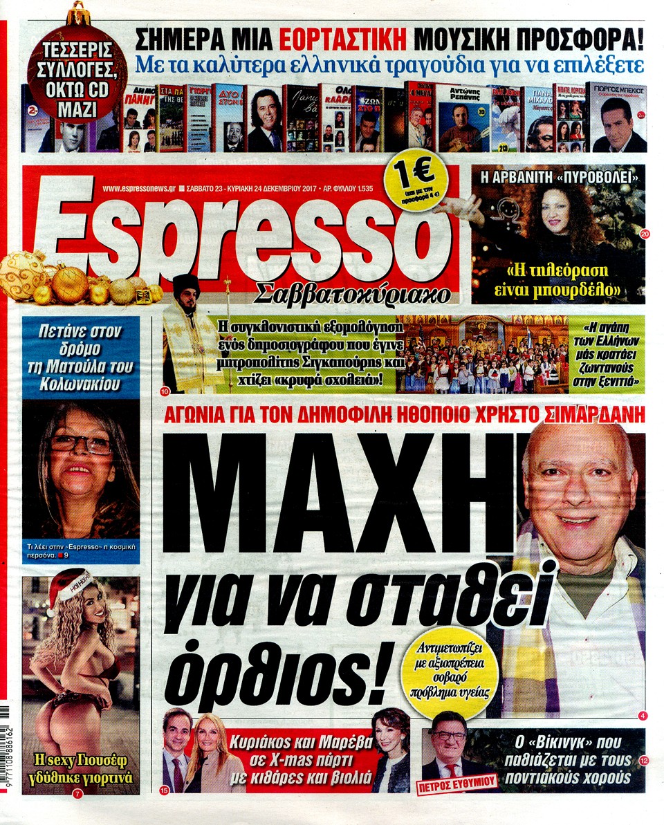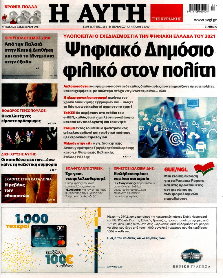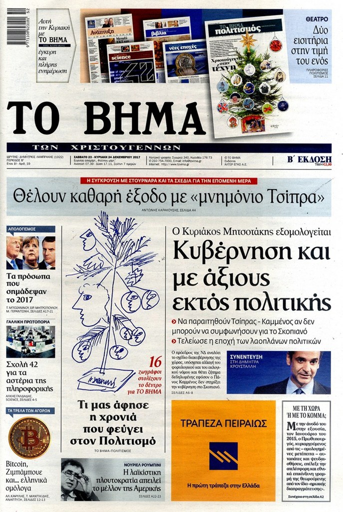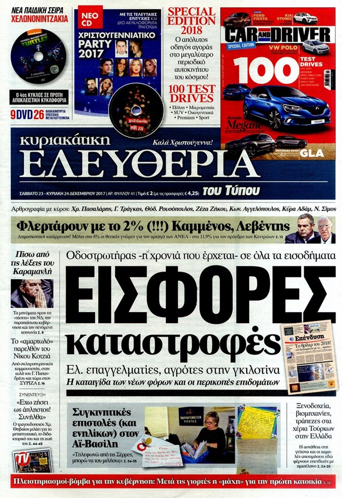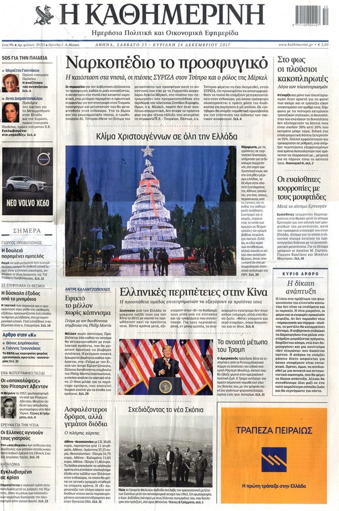 Διαβάστε τα πρωτοσέλιδα και τα οπισθόφυλλα των κυριακάτικων εφημερίδων που κυκλοφορούν εκτάκτως το Σάββατο λόγω των Χριστουγέννων:...