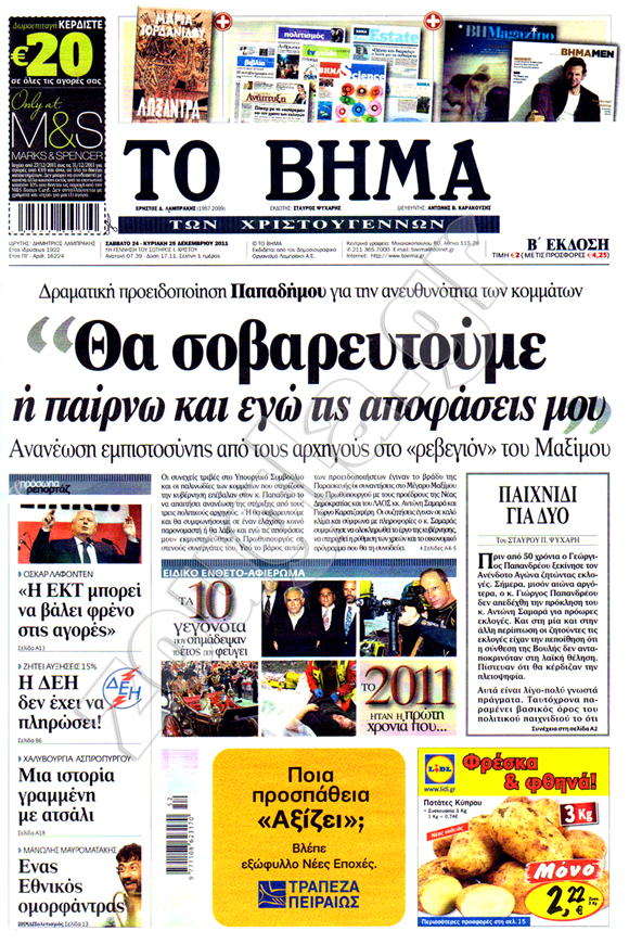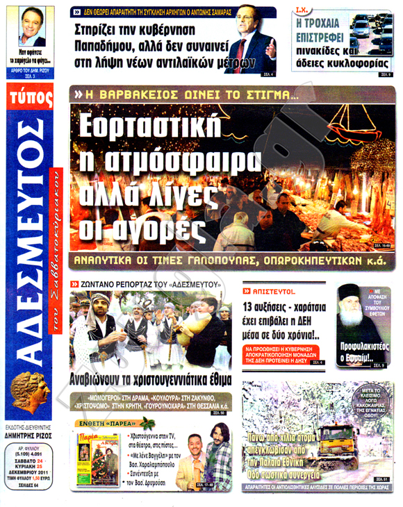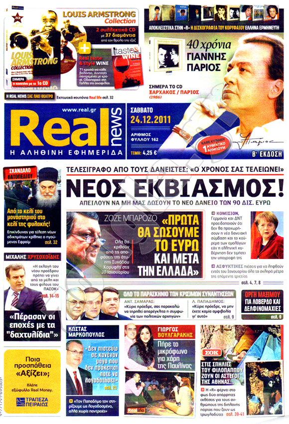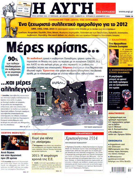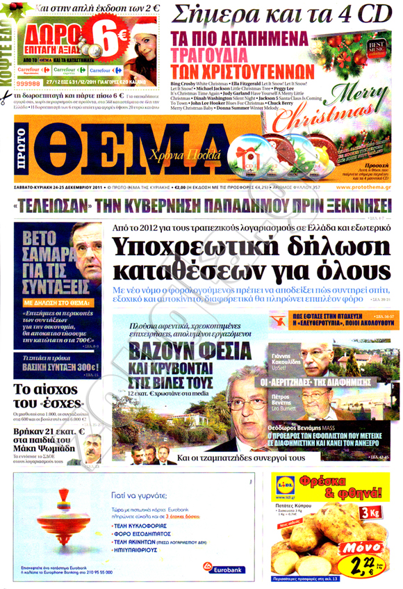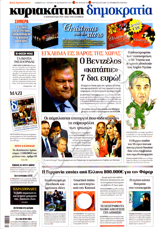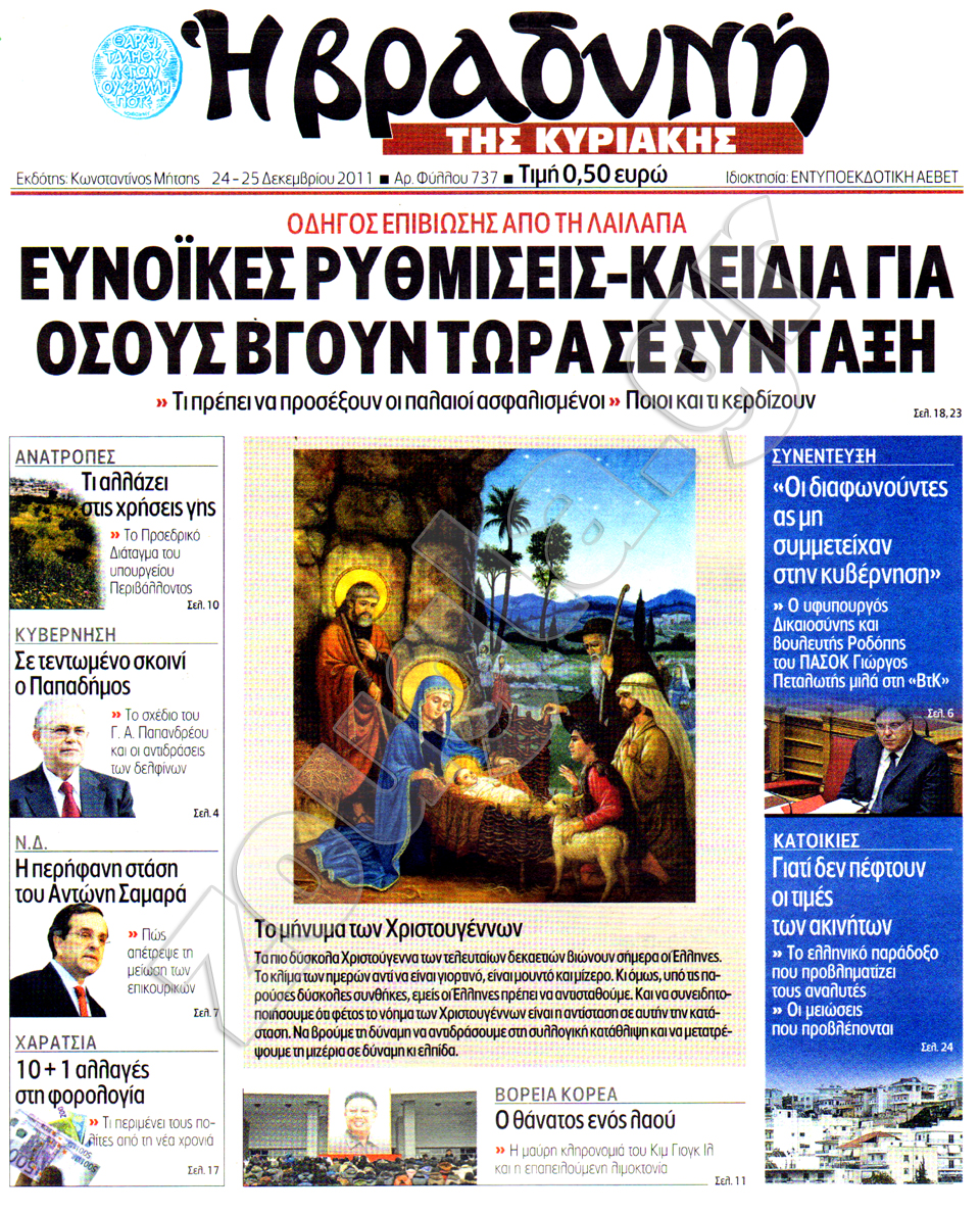Διαβάστε στη zougla.gr τα πρωτοσέλιδα των κυριακάτικων εφημερίδων, που κυκλοφορούν εκτάκτως σήμερα Σάββατο 24 Δεκεμβρίου.