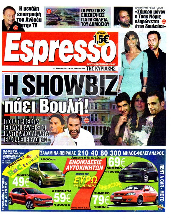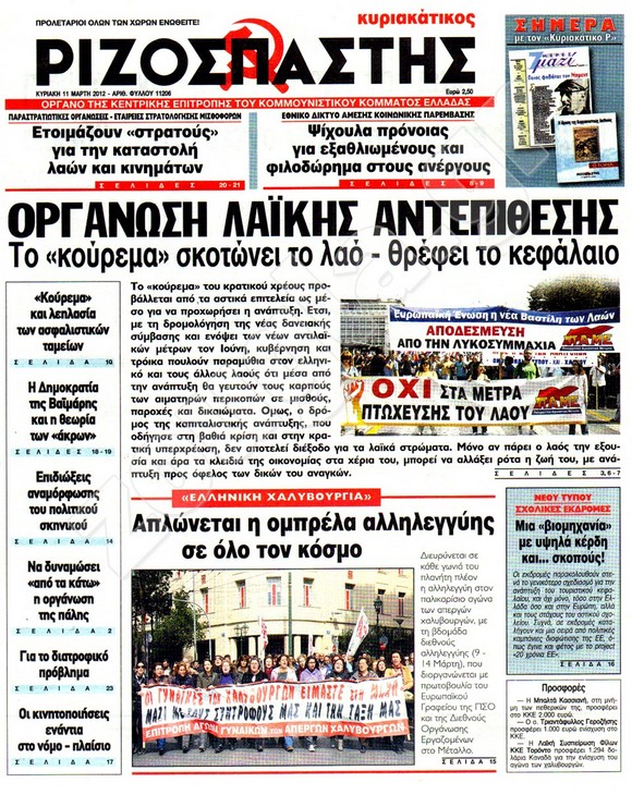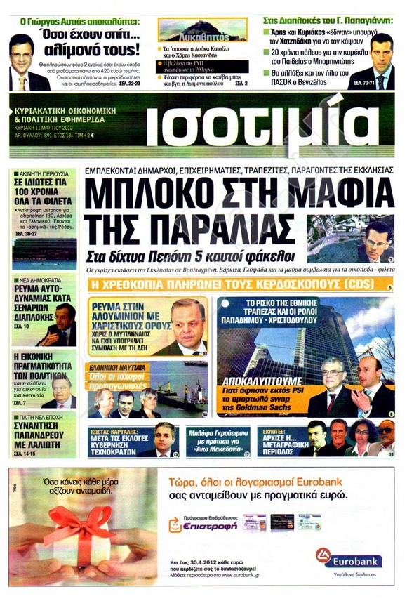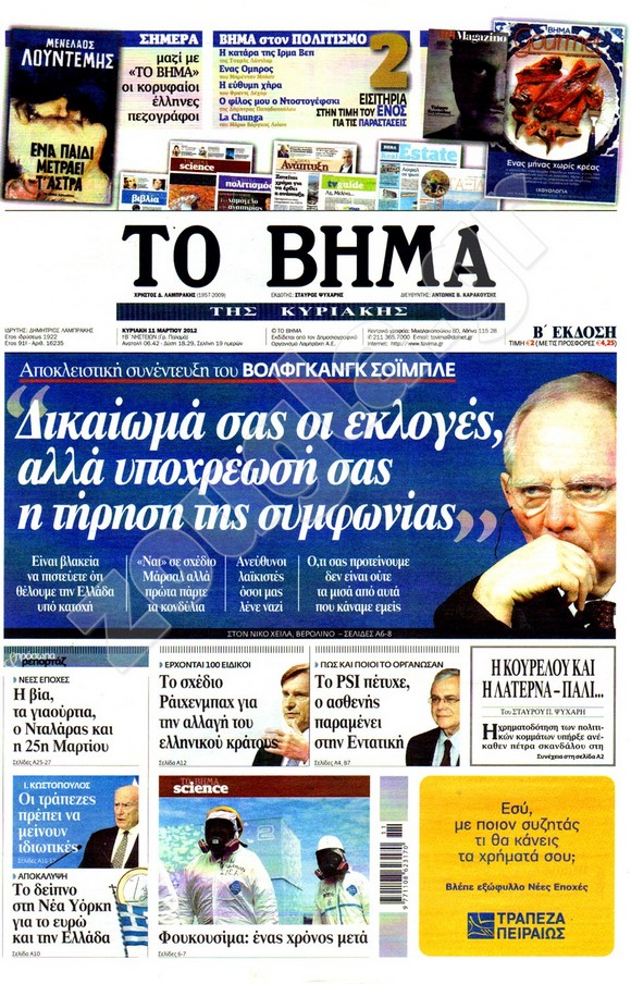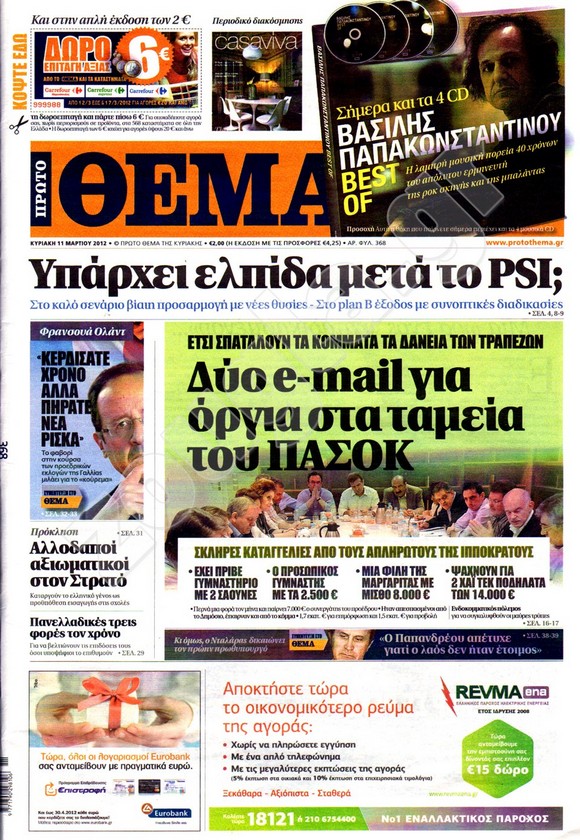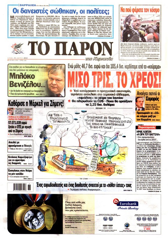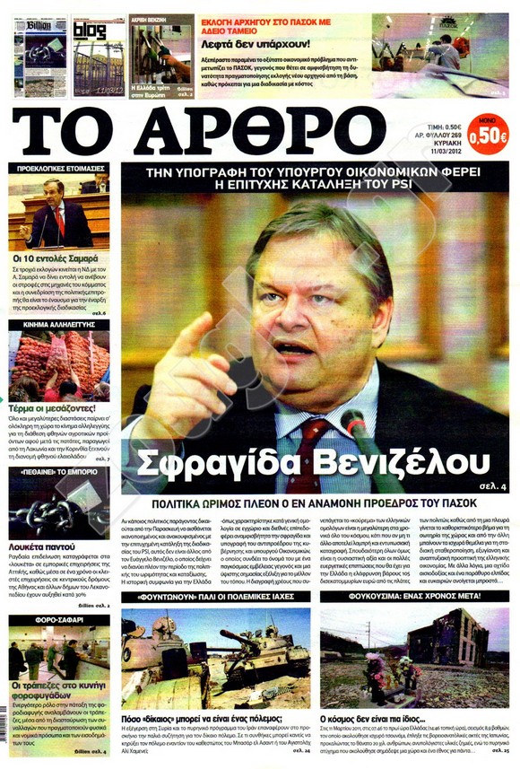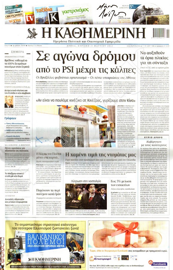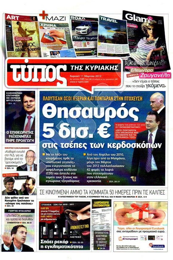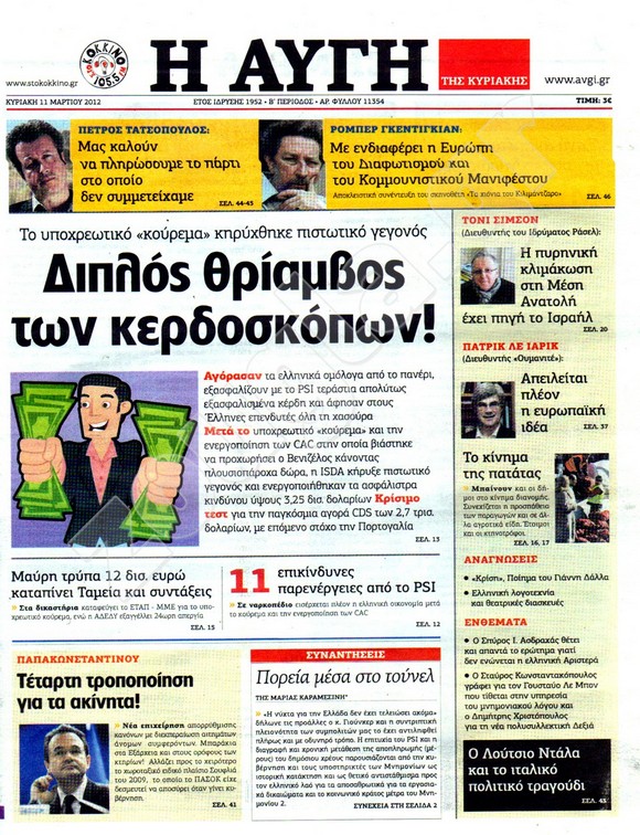 Media Τα πρωτοσέλιδα των κυριακάτικων εφημερίδων στη zougla.gr Διαβάστε στη zougla.gr τα πρωτοσέλιδα των κυριακάτικων εφημερίδων… Χρύσανθος Αναγνώστου 10.03.2012 | 20:58 UPD:10.03.2012, 20:58 Διαβάστε στη zougla.gr τα πρωτοσέλιδα των κυριακάτικων εφημερίδων. Η ΑΥΓΗ ΚΥΡΙΑΚΑΤΙΚΗ ΔΗΜΟΚΡΑΤΙΑ ΤΥΠΟΣ ΤΗΣ ΚΥΡΙΑΚΗΣ ESPRESSO ΕΘΝΟΣ ΙΣΟΤΙΜΙΑ ΚΑΘΗΜΕΡΙΝΗ ΚΕΡΔΟΣ ΠΑΡΑΣΚΗΝΙΟ ΠΡΩΤΟ ΘΕΜΑ REAL NEWS ΡΙΖΟΣΠΑΣΤΗΣ ΤΟ ΑΡΘΡΟ ΤΟ ΠΑΡΟΝ ΤΟ ΒΗΜΑ ΒΡΑΔΥΝΗ