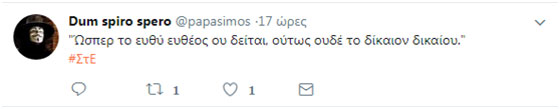 ΥστερόΓιωργο..: Η αρχαία ρήση που αναφέρει ο φίλος μας, ανήκει στον στωικό φιλόσοφο Επίκτητο και σημαίνει..: «Όπως το Ευθύ δεν χρειάζεται χάρακα, έτσι και το Δίκαιο δεν χρειάζεται δικαιοσύνη.».