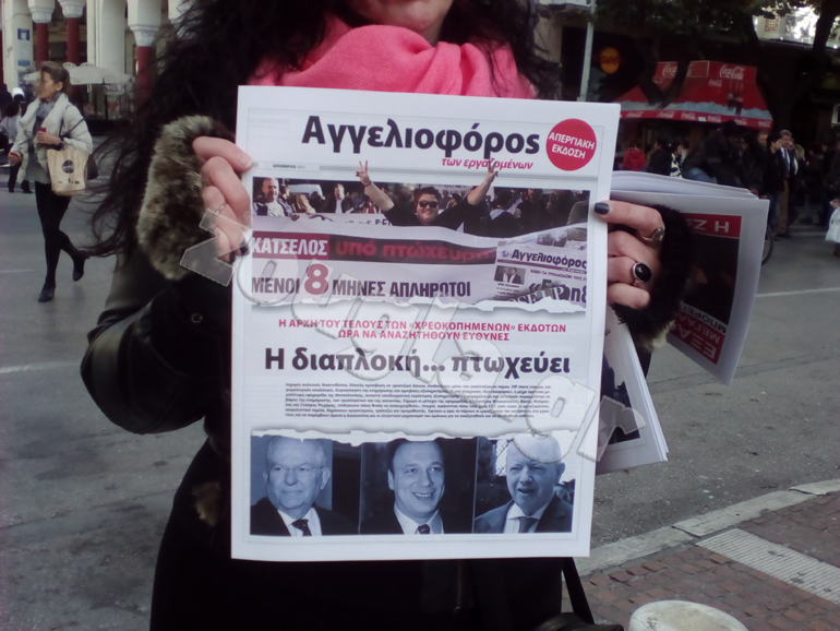Με τη δεύτερη απεργιακή έκδοση της εφημερίδας «Αγγελιοφόρος» βγήκαν την Τετάρτη οι πρώην εργαζόμενοι του ομίλου στο κέντρο της Θεσσαλονίκης. «Η έκδοση κυκλοφόρησε χάρις στον εθελοντισμό των εργαζομένων του “Αγγελιοφόρου” και ολοκληρώθηκε με επιτυχία κάτω από εξαιρετικά αντίξοες συνθήκες», ανέφεραν οι εργαζόμενοι. Μιλώντας στο zougla.gr, o εκπρόσωπος των εργαζομένων, δημοσιογράφος Γιώργος Μούλκας τόνισε: