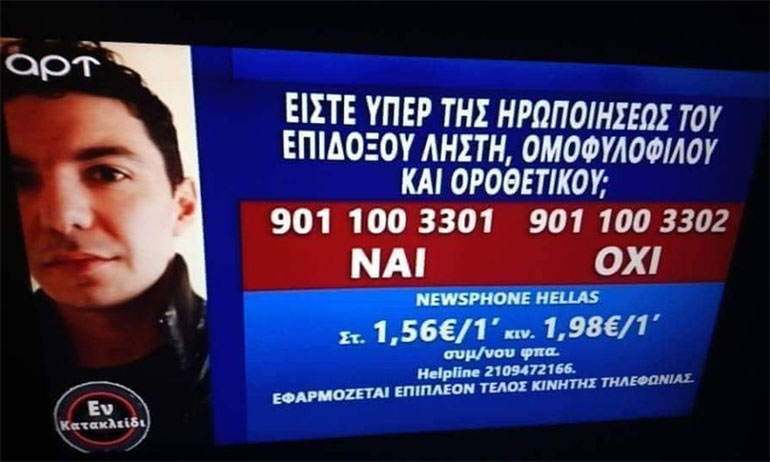 Συγκεκριμένα, o τηλεοπτικός σταθμός είχε θέσει ερώτημα: «Είστε υπέρ της ηρωποιήσεως του επίδοξου ληστή, ομοφυλόφιλου και οροθετικού».