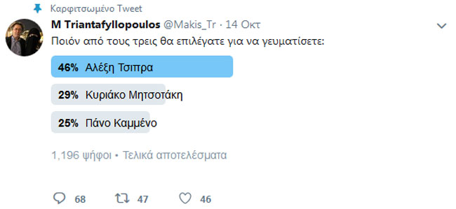 Ανήρτησε, λοιπόν, στο Twitter ο Μάκης Τριανταφυλλόπουλος το εξής ερώτημα: Με ποιoν θα επιθυμούσατε να γευματίσετε. Με τον Αλέξη Τσίπρα, τον Κυριάκο Μητσοτάκη ή τον Πάνο Καμμένο;