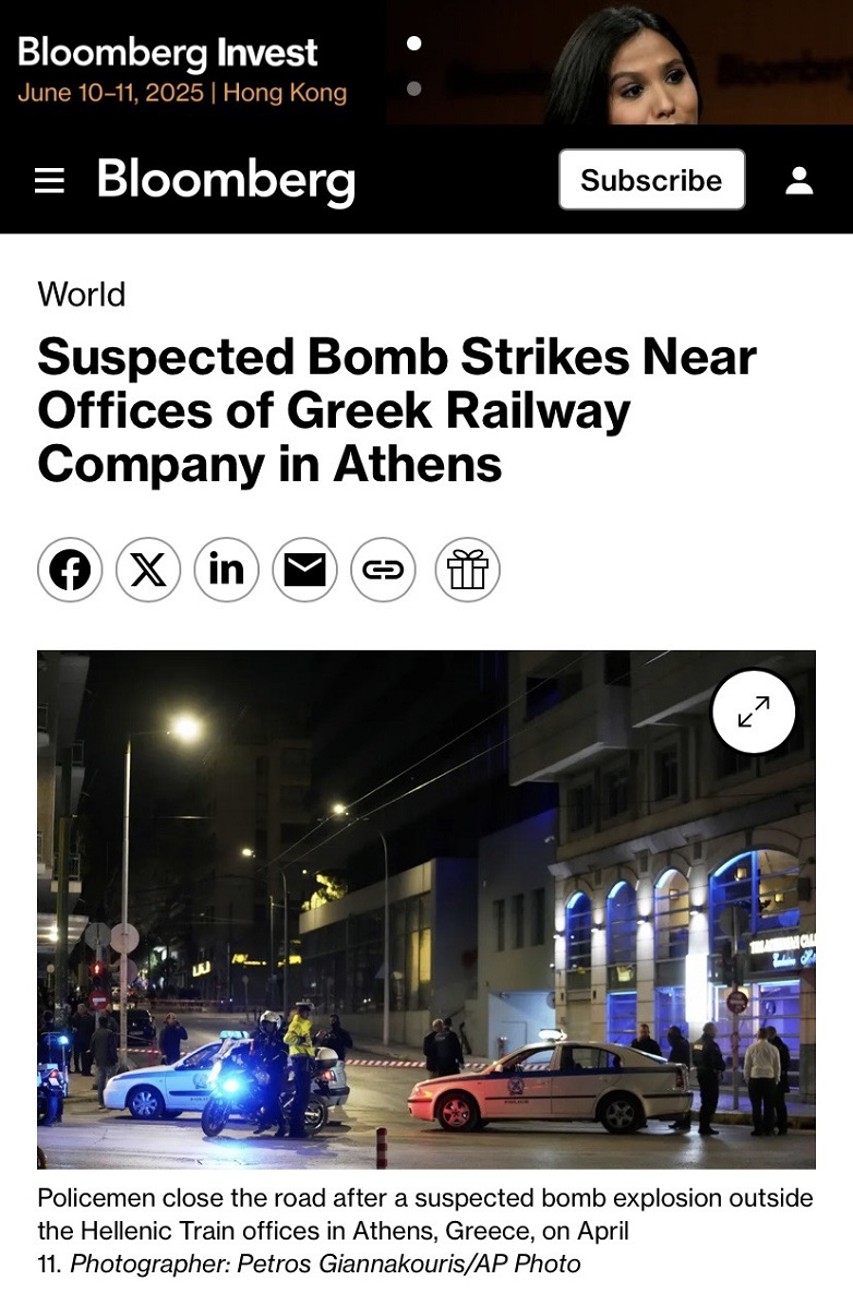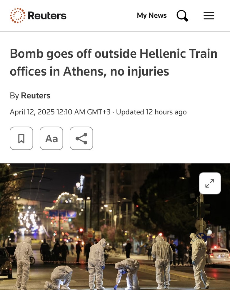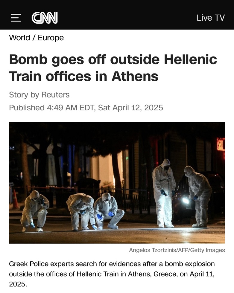 Τον γύρο του κόσμου μέσω των διεθνών δικτύων κάνει η έκρηξη του χαμηλής ισχύος εκρηκτικού μηχανισμού που εξερράγη τη νύχτα της Παρασκευής έξω από τα γραφεία της Hellenic Train.