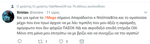 Οπότε, προς τιμήν ενός ανθρώπου τού «MEGA» που γνωρίζω πόσους ανθρώπους βοήθησε, αρνούμαι να αναφέρω έστω ένα από τα ονόματα τού «MEGA» που όλοι απεχθανόμαστε.