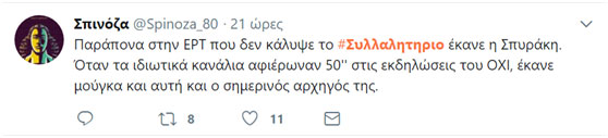 Αξιολογώ ότι στο σχετικό ερώτημα που τού υποβλήθηκε, η απάντησή του συνιστά ατόπημα• δεν είναι δυνατόν να λες -όταν πρόκειται για τέτοια πολυπληθή συγκέντρωση Ελλήνων πολιτών (και Ελληνίδων πωλητριών, βεβαίως)- πως δεν είναι ο ρόλος τής Δημόσιας Τηλεόρασης να καλύπτει συλλαλητήρια.