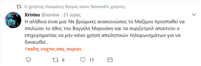 απειλητικό τηλεφώνημα τού Βαγγέλη Μαρινάκη.