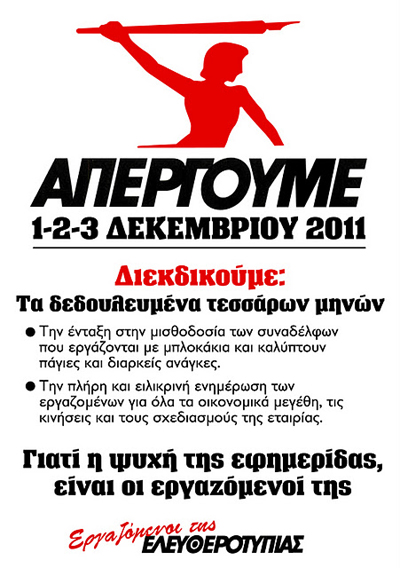 Σε νέα τριήμερη απεργία προχωρούν από σήμερα οι εργαζόμενοι στην εφημερίδα «Ελευθεροτυπία», έπειτα από σχετική απόφαση των διοικητικών συμβουλίων της ΕΣΗΕΑ, της ΕΠΗΕΑ, της Πανελλαδικής Ένωσης Λιθογράφων, της ΕΣΠΗΤ, της Ένωσης Φωτορεπόρτερ Ελλάδος και της Ένωσης Προσωπικού Πρακτορείων Εφημερίδων Αθηνών.