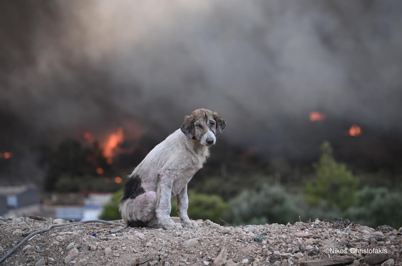 Πρόκειται για την εικόνα με ένα σκυλάκι το οποίο προφανώς φοβισμένο και σε κατάσταση σοκ λόγω του πύρινου μετώπου και της ανυπόφορης ζέστης, κοιτάζει τον φωτορεπόρτερ… θλιμμένο.