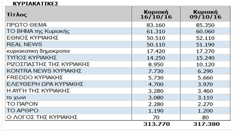 Δείτε στον πίνακα τι πούλησαν τα κυριάκατικα τις δύο προηγούμενες εβδομάδες:
