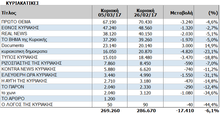 Περισσότερα από 17.000 φύλλα έχασαν πανελλαδικά οι κυριακάτικες εφημερίδες την εβδομάδα που πέρασε...