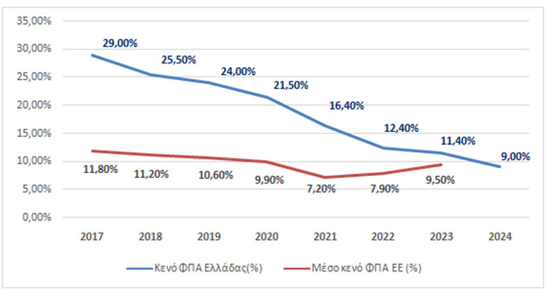 Η πτωτική τάση του κενού ΦΠΑ στην Ελλάδα συνεχίζεται, με τις προκαταρκτικές εκτιμήσεις για το 2024 να προβλέπουν περαιτέρω μείωσή του στο 9,0%.