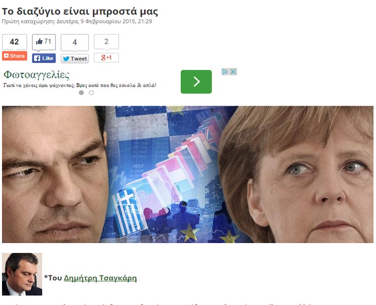 Ένα ερώτημα που οφείλει να ξεκαθαρίσει στο μυαλό της η ελληνική πλευρά είναι το αν επιθυμούμε να διορθώσουμε την πράγματι «γερμανική» Ευρώπη ή να επιλύσουμε το δικό μας εθνικό-ελληνικό πρόβλημαΈνα success story που δεν επαληθεύτηκε στην καθημερινότητά μας και στην οικονομία, ούτε στην επιτυχή αξιολόγηση των «συμφωνηθέντων» από τους τροϊκανούς, και που οδήγησε τον ελληνικό λαό στην ανατροπή του πολιτικού σκηνικού πρόσφατα με τη σαρωτική νίκη του ΣΥΡΙΖΑ. Η νέα κυβέρνηση τάχιστα αποδόμησε το success story και ανέδειξε το θέμα του κουρέματος του χρέους, της εκκρεμότητας των γερμανικών αποζημιώσεων και της ανάγκης για μια αναπτυξιακή πολιτική υπέρ των χωρών της περιφέρειας.
