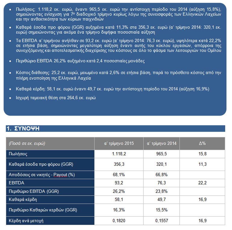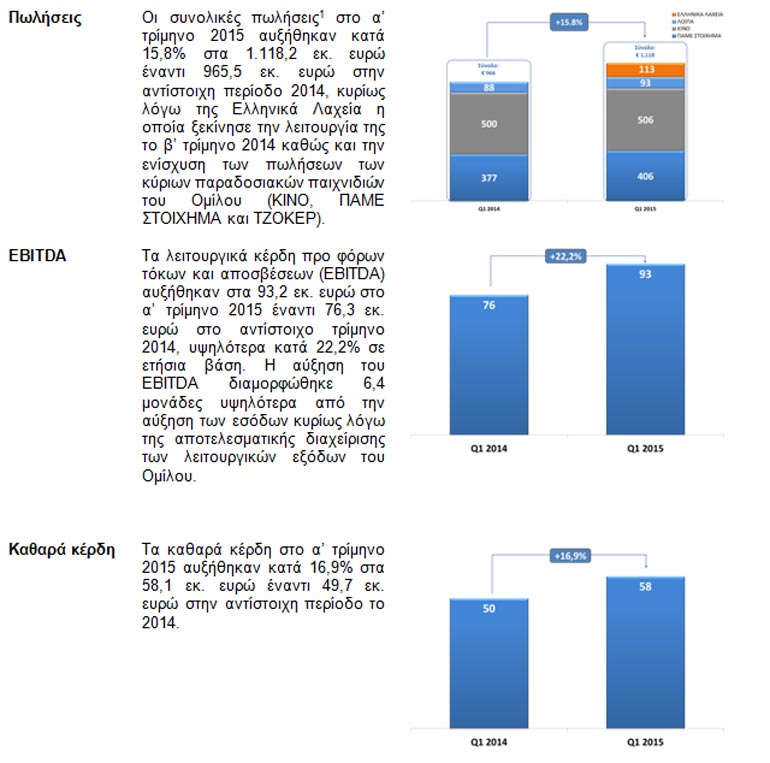 Οι πωλήσεις ενισχύθηκαν κατά 15,8% στα 1,18 δις. ευρώ. Σύμφωνα με τη διοίκηση, πρόκειται για το 7ο στη σειρά ανοδικό τρίμηνο, χάρη στη συνεισφορά των Ελληνικών Λαχείων και την ανθεκτικότητα των κύριων παιχνιδιών.