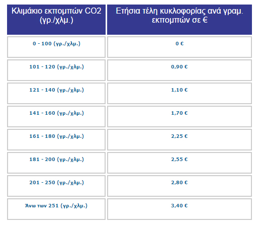 Εκτιμάται πως η αύξηση για τα οχήματα, ηλικίας έως και 5 ετών και κυβισμού πάνω από ένα συγκεκριμένο όριο, θα κυμανθεί από 5-7%, με το Υπουργείο Οικονομικών να προσανατολίζεται σε σημαντικές αλλαγές στα τέλη κυκλοφορίας προς αναζήτηση εσόδων. Μέχρι σήμερα, τα αυτοκίνητα με ταξινόμηση από 1/11/2010 και μετά, επιβαρύνονται με τέλη αποκλειστικά με βάση τις εκπομπές διοξειδίου του άνθρακα σύμφωνα με τον παρακάτω πίνακα: