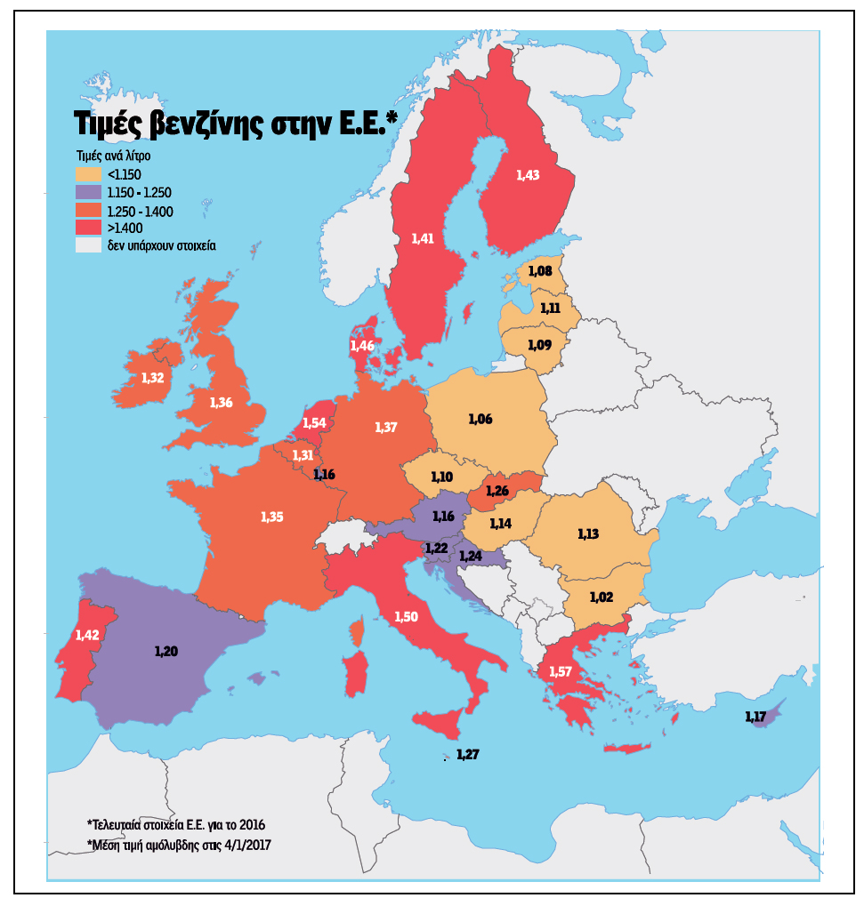 Με βάση τα τελευταία επίσημα στοιχεία τηςΕυρωπαϊκής Ενωσης, της 19ης Δεκεμβρίου 2016, η τελική τιμή της βενζίνης στην Ελλάδα ήταν η τέταρτη ακριβότερη μετά την Ολλανδία, την Ιταλία και τη Δανία, κατάταξη που μπορεί να έχει ανατραπεί μετά τις πρόσφατες φορολογικές επιβαρύνσεις στη χώρα μας.