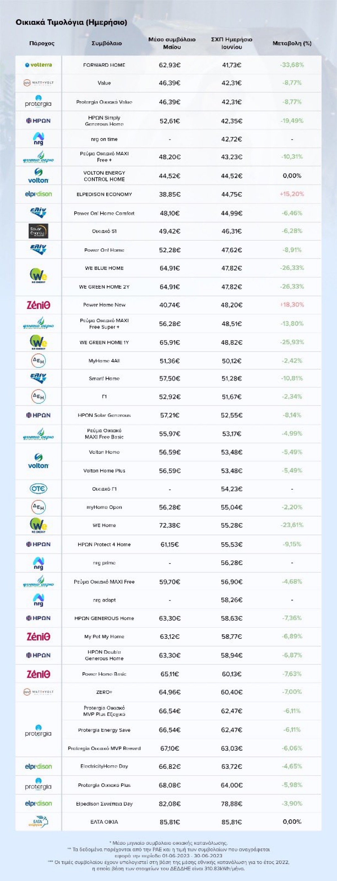 «Σήμερα ανέβηκαν οι τιμές ενέργειας για τον μήνα Ιούνιο στον e-katanalotis, με σταθμισμένη ανά μερίδιο αγοράς παρόχου τη μείωση να υπολογίζεται στο -7%!».