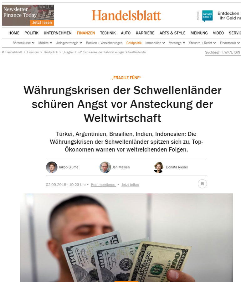 Ανησυχία για τις «εύθραυστες πέντε» είναι ο τίτλος άρθρου στην οικονομική επιθεώρηση «Handelsblatt», όπου ο αριθμός πέντε παραπέμπει στην Τουρκία, την Αργεντινή, τη Βραζιλία, την Ινδία και στην Ινδονησία, πέντε αναδυόμενες οικονομίες.