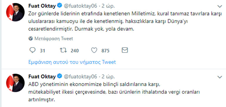 «Η Τουρκία προχώρησε σε αύξηση των τελωνειακών δασμών σε εισαγόμενα αμερικανικά προϊόντα βάσει της αρχής της αμοιβαιότητας, σε αντίποινα στις εσκεμμένες επιθέσεις της αμερικανικής κυβέρνησης στην οικονομία μας», ανέφερε σε σχετική ανάρτησή του στο Twitter ο Τούρκος αντιπρόεδρος Φουάτ Οκτάι.