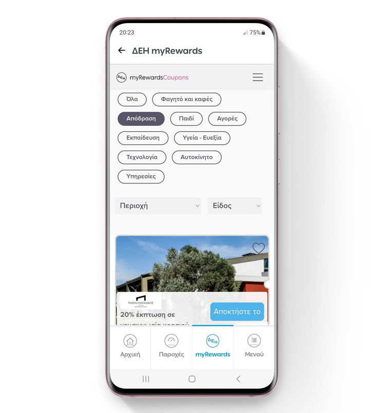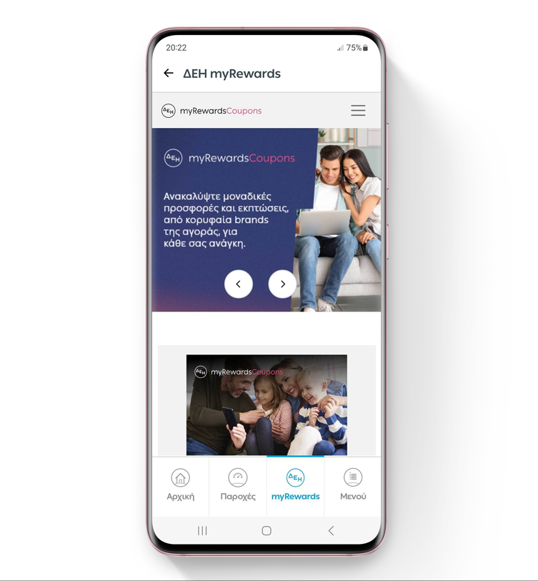 Στην ενότητα ΔΕΗ myRewards στο νέο myΔΕΗ, οι πελάτες της ΔΕΗ μπορούν να βρουν δωρεάν και να αποκτήσουν κουπόνια για φαγητό και καφέ, αποδράσεις, προσφορές για παιδιά, αγορές, εκπαίδευση, υγεία και ευεξία, τεχνολογία, αυτοκίνητο και υπηρεσίες.