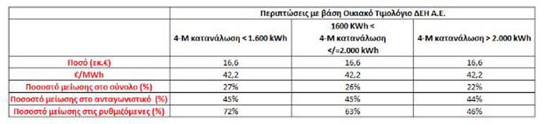 -Η έκπτωση είναι 42 ευρώ/ μεγαβατώρα και θα ισχύει για όλους τους προμηθευτές ηλεκτρικής ενέργειας. Η έκπτωση των 42 ευρώ/MWh αντιστοιχεί σε έκπτωση της τάξης του 27% στο σύνολο του λογαριασμού (ή 45% επί του ανταγωνιστικού τιμολογίου της ΔΕΗ) για καταναλώσεις έως 1.600 KWh το τετράμηνο, που είναι η κατανάλωση ενός μέσου νοικοκυριού.