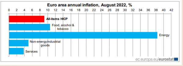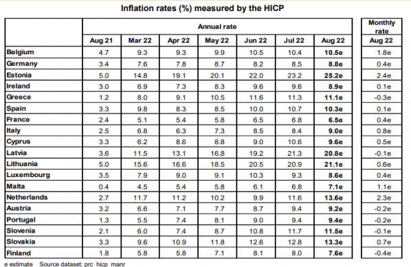 Σε ό,τι αφορά την ευρωζώνη, ο μέσος πληθωρισμός εκτιμάται 9,1% τον Αύγουστο του 2022, από 8,9% τον Ιούλιο σύμφωνα με την Ευρωπαϊκή Στατιστική Υπηρεσία.