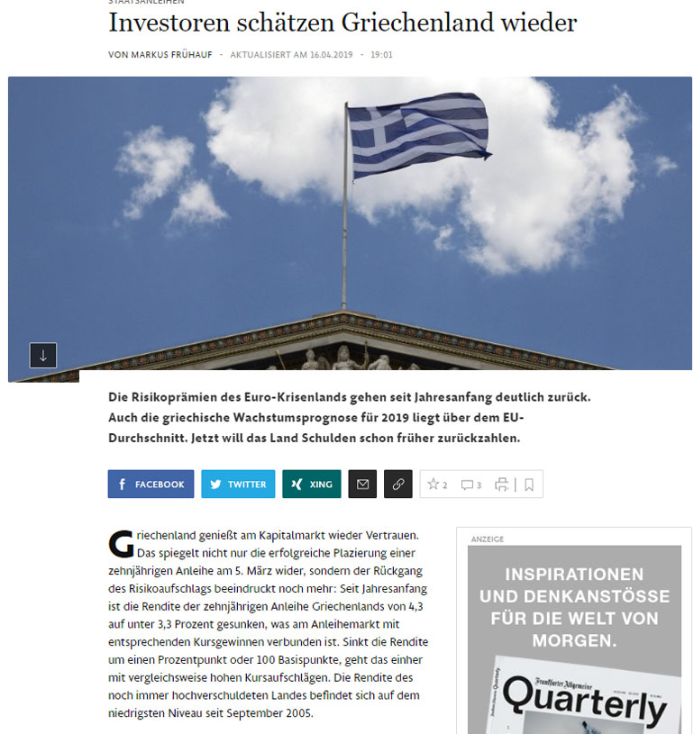 «Τα ασφάλιστρα κινδύνου της Ελλάδας έχουν μειωθεί σημαντικά από την αρχή του έτους. Και η πρόβλεψη ανάπτυξης για το 2019 είναι επίσης υψηλότερη από τον μέσο όρο της Ε.Ε. Τώρα η χώρα θέλει να ξεπληρώσει και το χρέος της νωρίτερα» γράφει η «Frankfurter Allgemeine Ζeitung».