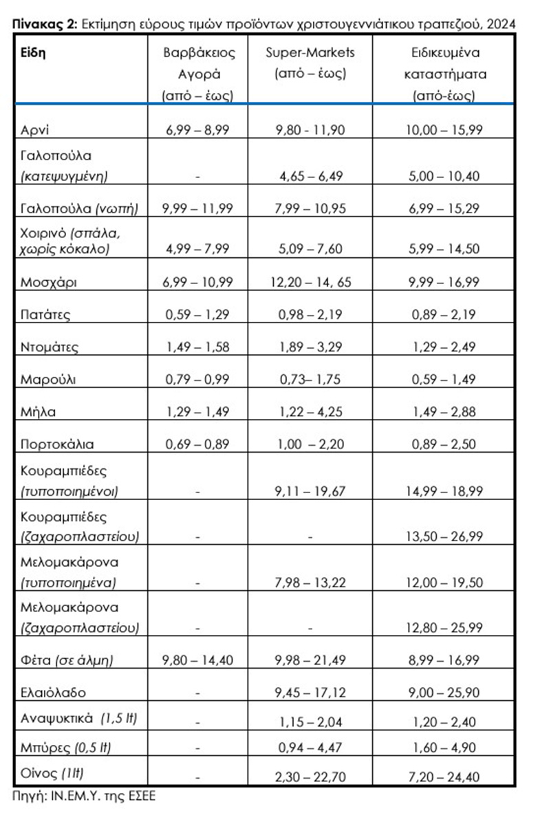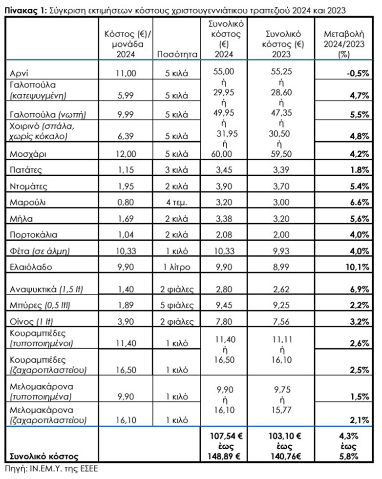 Πιο συγκεκριμένα, το Ινστιτούτο Εμπορίου και Υπηρεσιών της Ελληνικής Συνομοσπονδίας Εμπορίου και Επιχειρηματικότητας (ΙΝ.ΕΜ.Υ.-ΕΣΕΕ), εκτίμησε το κόστος του χριστουγεννιάτικου τραπεζιού για το 2024. Καταγράφηκαν, με επιτόπια τιμοληψία και συνεντεύξεις με key-informers της αγοράς, οι τιμές τόσο από αλυσίδες σούπερ μάρκετ, όσο και από ειδικευμένα καταστήματα λιανικής (πχ ζαχαροπλαστεία/ κρεοπωλεία κτλ.), καθώς και από τη Βαρβάκειο αγορά.
