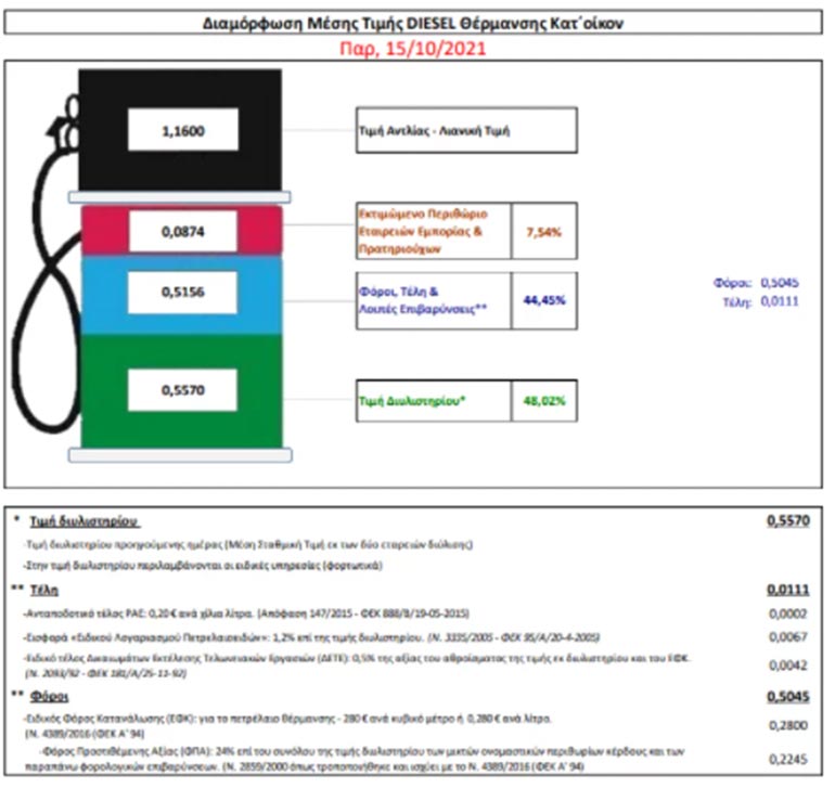 Σχετικά με το κόστος θέρμανσης της νέας χρονιάς, ενδιαφέρον στοιχείο είναι και ο διαχωρισμός της φορολογίας, έναντι της πραγματικής αξίας του καυσίμου. Ειδικότερα, η τιμή του διυλιστηρίου διαμορφώνεται στα 0,557 ευρώ. Το περιθώριο κέρδους των εταιρειών και των πρατηριούχων δεν ξεπερνά τα 0,0874 ευρώ. Συνεπώς, το υπόλοιπο ποσό στην αντλία οδηγείται στα φορολογικά ταμεία, λόγω των φόρων και των τελών.