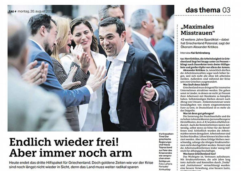 Τέλος, η αριστερή εφημερίδα Tageszeitung παρουσιάζει μια φωτογραφία με έναν χαμογελαστό Αλέξη Τσίπρα και επιγράφει το άρθρο με τον τίτλο «Επιτέλους ελεύθερος αλλά ακόμη φτωχός». Στο σχόλιο με τον τίτλο «Μάστερ καταστροφής» ο αρθρογράφος περιγράφει με τα πιο μελανά χρώματα τα λάθη που έγιναν σε αυτό τον διάστημα. Και επισημαίνει μια ενδιαφέρουσα πτυχή. «Δεν έγιναν όμως όλα σχεδόν λάθος μόνο από πλευράς σύλληψης σχεδίου αλλά και σε ατμοσφαιρικό επίπεδο» σημειώνει ο σχολιαστής. «Με την σύμπραξη υψηλότατων κύκλων έγινε της μόδας μια γλώσσα του τύπου, ‘ημείς εναντίον υμών’. Ο επιμελής βορράς εναντίον των τεμπέληδων νοτίων. Οι φιλόπονοι Γερμανοί εναντίον των χρεοκοπημένων Ελλήνων … Ένα ολόκληρο κράτος έγινε αποδέκτης εντολών, υποβαθμίστηκε».