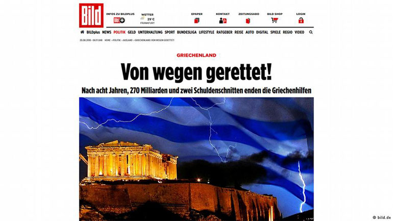 Η εφημερίδα Bild, που διαδραμάτισε κορυφαίο ρόλο στην κίτρινη δημοσιογραφία χτυπώντας πολλές φορές κάτω από τη μέση Έλληνες πολιτικούς και πολίτες συνεχίζει στο ίδιο οικείο μοτίβο. Κυκλοφορεί με τον τίτλο «Σιγά που σώθηκε» εννοώντας την Ελλάδα. Οι αρθρογράφοι φιλοξενούν απόψεις του καθηγητή Οικονομικών Γιώργο Βάμβουκα, του αντιπροέδρου της Ένωσης Φορολογουμένων Θρασύβουλου Μίαρη και του Γιάννη Χατζησαλάτα από το Συνδικάτο Εφοριακών Αττικής που μεταφέρουν τη ζοφερή εικόνα της χώρας, έτσι τουλάχιστον όπως εκείνοι την προσλαμβάνουν. Στο σχόλιο της ίδιας εφημερίδας ο αρθρογράφος επιγράφει το άρθρο του με τη φράση «Χαμένη εμπιστοσύνη».