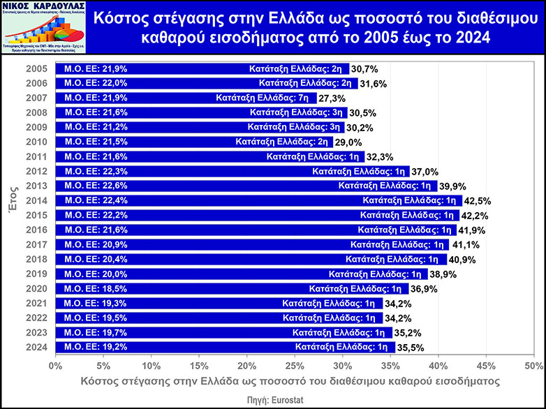 ☑ Το κόστος στέγασης για το μέσο ελληνικό νοικοκυριό σαν ποσοστό του διαθέσιμου καθαρού εισοδήματος είναι το υψηλότερο ποσοστό μεταξύ των 27 χωρών της ΕΕ από το 2011 και μετά.