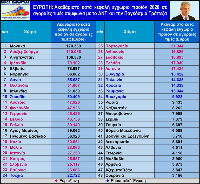 Στον παρακάτω πίνακα αποτυπώνεται το ακαθάριστο κατά κεφαλή εγχώριο προϊόν σε αγοραίες τιμές για το έτος 2020 στην Ευρώπη, σύμφωνα με στοιχεία του Διεθνούς Νομισματικού Ταμείου (ΔΝΤ) και της Παγκόσμιας Τράπεζας.