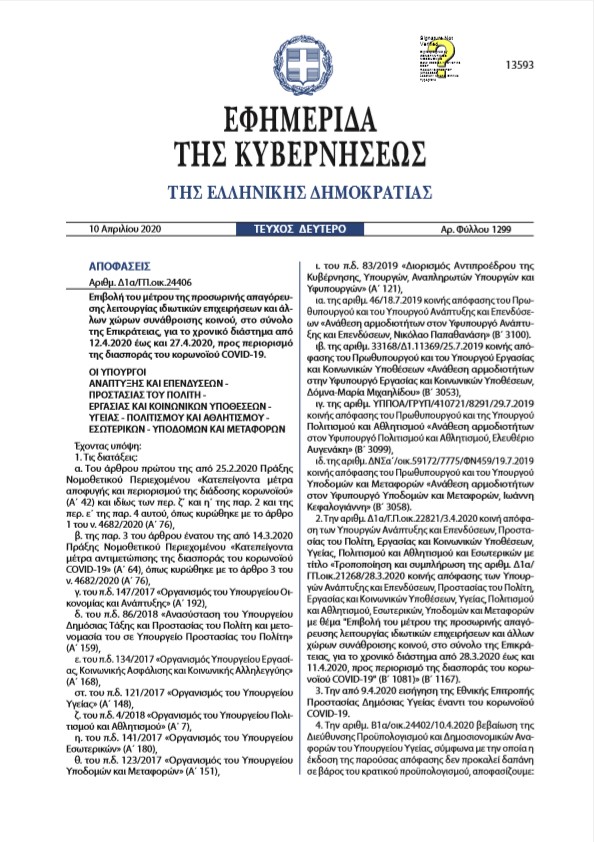 Κλειστές έως τις 27 Απριλίου θα παραμείνουν όλες οι επιχειρήσεις που εντάσσονται στους ΚΑΔ και έχουν κλείσει προσωρινά για τον περιορισμό της διασποράς του κορωνοϊού. Η απόφαση δημοσιεύθηκε σήμερα στο ΦΕΚ και από το μέτρο εξαιρούνται οι υπηρεσίες ηλεκτρονικού ή τηλεφωνικού εμπορίου με παράδοση κατ ‘ οίκον (e-shop κτλ.) που προσφέρουν οι επιχειρήσεις που εντάσσονται στους 67 πληττόμενους ΚΑΔ.